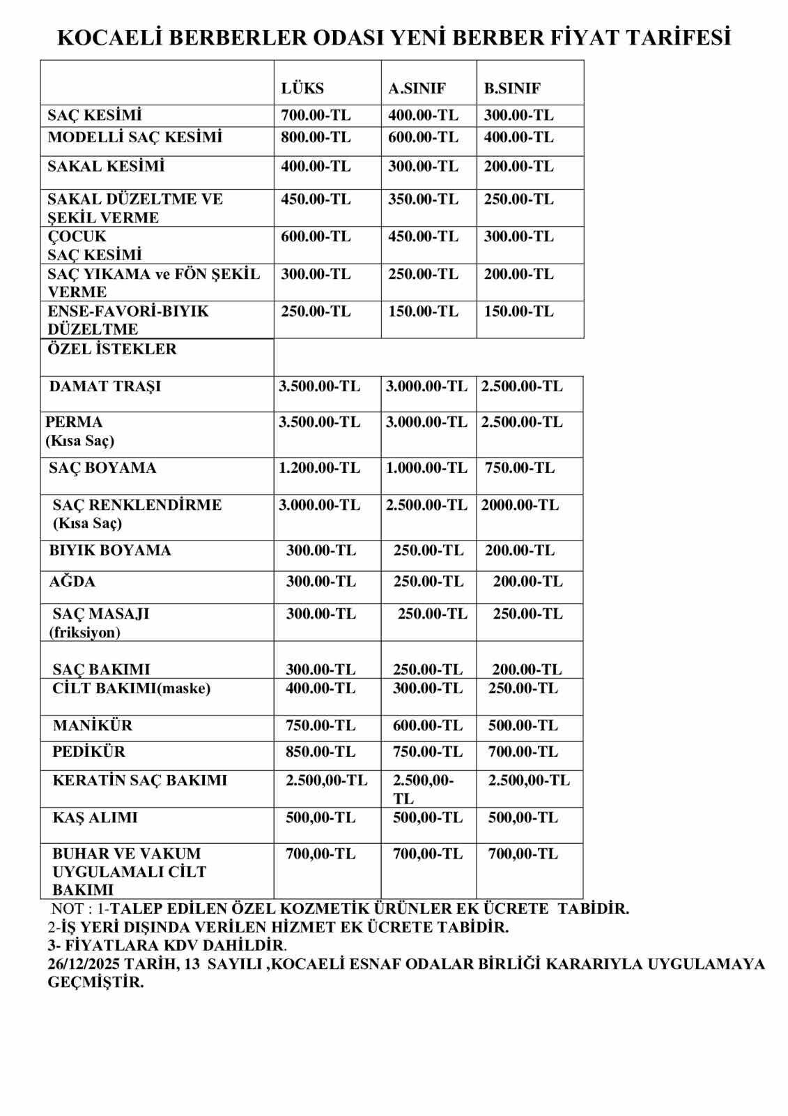 Kocaeli Esnaf Odaları Birliği’nin kararıyla onaylanan tarife; lüks, A sınıfı ve B sınıfı işletmeler için ayrı ayrı belirlendi. Fiyatlara KDV dahil edilirken, talep edilen özel kozmetik ürünler ile iş yeri dışında verilen hizmetlerin ek ücrete tabi olacağı bildirildi. Kocaeli Berberler Esnaf ve Sanatkarlar Odası Başkanı Mustafa Bozkurt, il genelindeki tüm ilçelerde yeni tarifelerin Ocak 2026 itibarıyla eş zamanlı olarak yürürlüğe gireceğini duyurarak tarifeleri açıkladı.