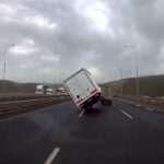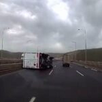 Kuzey Marmara Otoyolu’nun Kocaeli geçişinde seyir halindeki bir kamyonetin fırtına nedeniyle devrildiği anlar güvenlik kamerasına yansıdı.