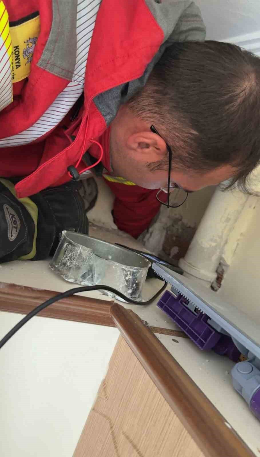 Konya’da 4 katlı apartmanın bacasındaki kedi itfaiye ekiplerinin 6 saatlik çalışmasıyla kurtarıldı