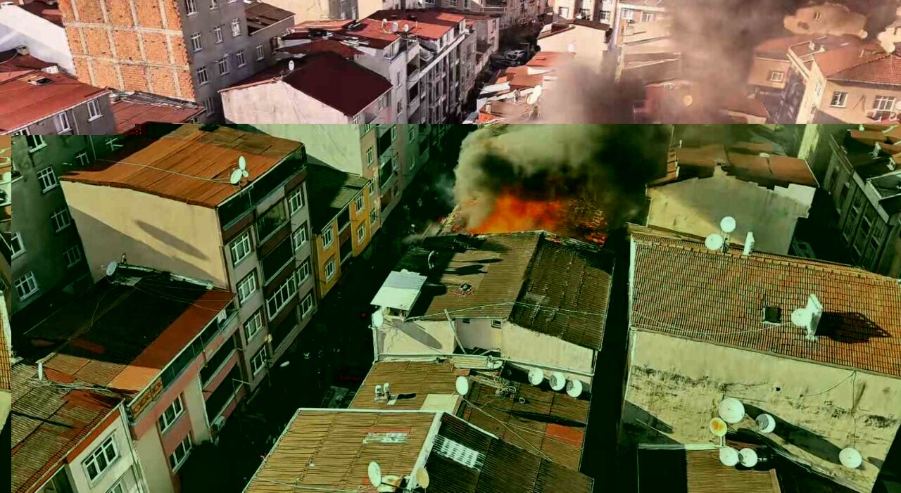 Küçükçekmece’de 3 çatılı bir binanın çatı katı, çıkan yangında tamamen alevlere teslim oldu. Bitişikteki binanın çatısına çıkan bir vatandaş, bahçe hortumuyla su sıkarak yangına müdahale ederken, itfaiye ekiplerinin alevleri söndürme çalışmaları havadan görüntülendi.