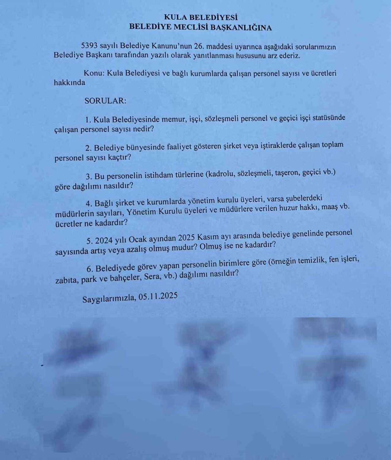 Kula Belediyesi’nde görev yapan personel sayısı yeniden tartışma konusu oldu. Cumhur İttifakı’nın belediye meclis üyeleri, belediyedeki çalışan sayısı ve görev dağılımıyla ilgili kapsamlı bir soru önergesi hazırlayarak meclis gündemine taşıdı. Ancak, bu önerge mecliste oylanarak reddedildi.