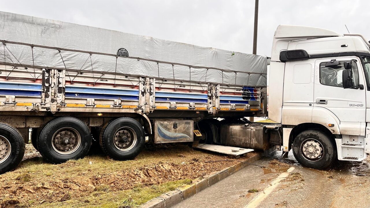 Manisa’nın Kula ilçesinde yağışlı havanın etkisiyle kayganlaşan yolda sürücüsünün kontrolünden çıkan tır orta refüje çıktı, sürücü yara almadı.