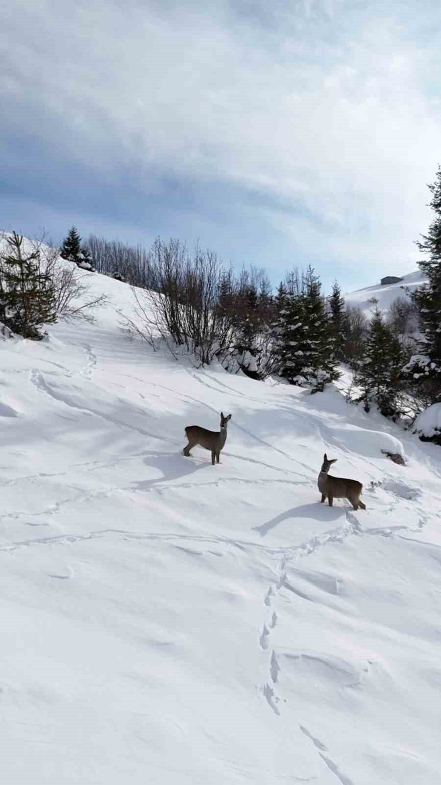 Yoğun kar yağışı sonrasında sessizliğe bürünen yaylada ortaya çıkan karacalar, doğal yaşamın kış aylarındaki güzelliklerini gözler önüne serdi. Kar örtüsü üzerinde besin arayan karacaların, zaman zaman kara bata çıka ilerlediği ve bazı karacaların ise dron kamerasını merakla takip ettiği anlar görüntülere yansıdı.