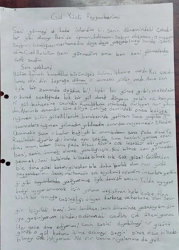 Yarışmada il birincisi olan Ayşe Nuran Akarçay, “Peygamberimizi (s.a.s.) çok seviyorum. Onun sözlerini ve davranışlarını öğrenmeyi çok seviyorum. Ona mektup yazmak benim için çok güzel bir duyguydu” diye konuştu.