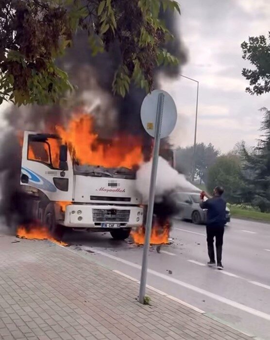 BURSA ÇEVRE OTOYOLU’NDA SEYİR HALİNDEKİ BİR KAMYONDA YANGIN ÇIKTI