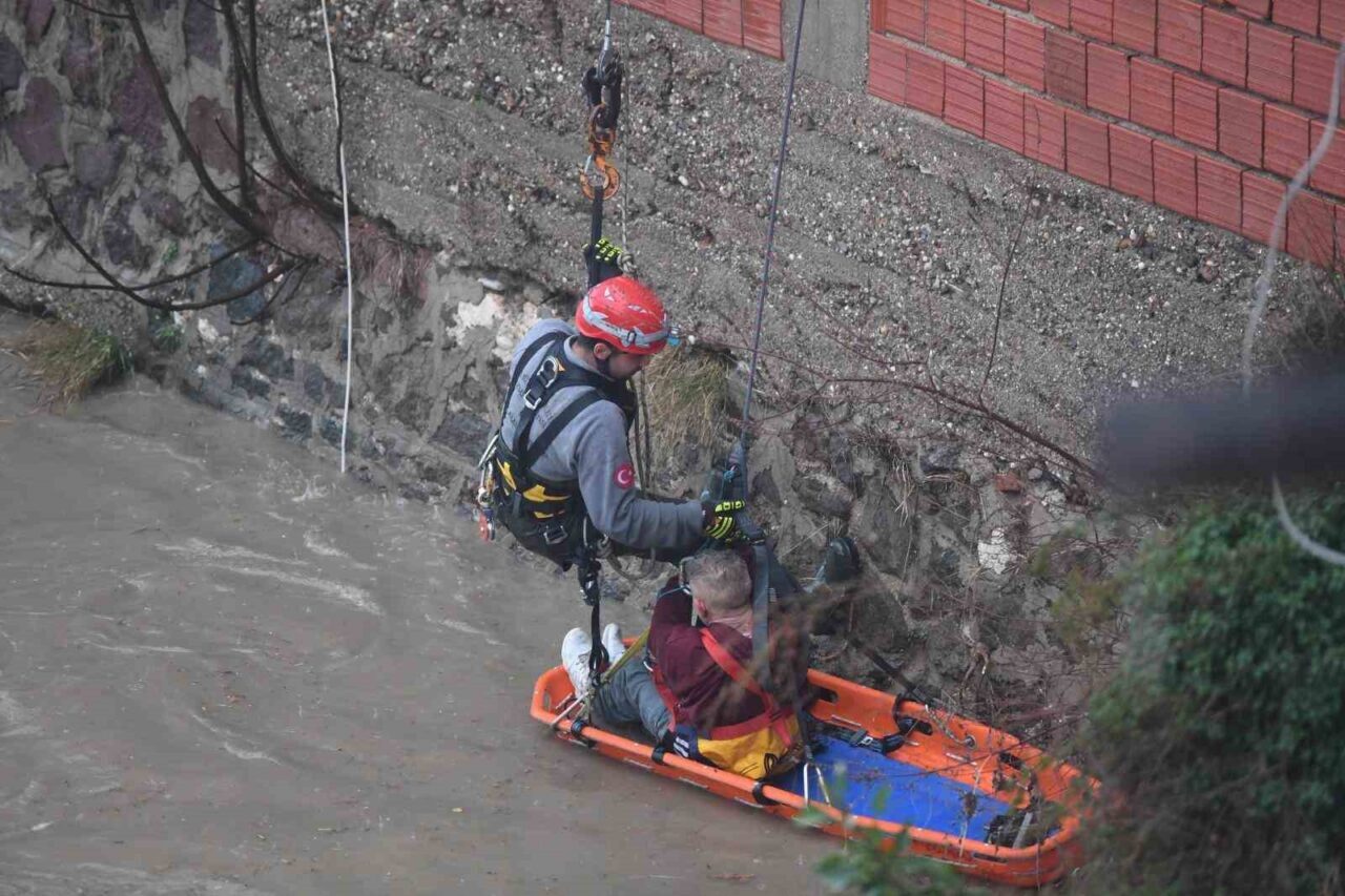 İzmir’de etkili olan sağanak yağış sırasında, 50-55 yaşlarındaki bir erkek Yeşildere’de dere içinde uyuduğu sırada yükselen sulara kapıldı. Yaklaşık 20 metre sürüklenen kişiyi tutunduğu noktada, ihbar üzerine olay yerine gelen İzmir Büyükşehir Belediyesi İtfaiye Dairesi Başkanlığı ekipleri kurtardı. Su seviyesinin yaklaşık 2 metreye ulaştığı dereye vinç yardımıyla inen ekipler, vatandaşı bulunduğu noktadan kurtardı. Sedye ile yaklaşık 10 metrelik duvardan çıkarılan yurttaş, sağlık ekiplerine teslim edilerek hastaneye sevk edildi.
