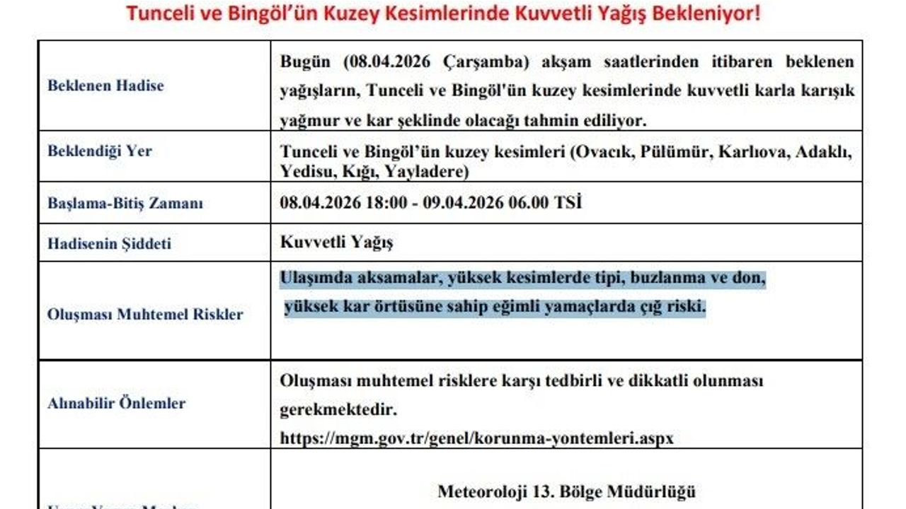 Meteoroloji 13. Bölge Müdürlüğü, Tunceli ve Bingöl için kuvvetli yağış uyarısı yaptı. Yapılan açıklamada, “Bugün (08.04.2026 Çarşamba) akşam saatlerinden itibaren beklenen yağışların, Tunceli ve Bingöl'ün kuzey kesimlerinde karla karışık yağmur ve kar şeklinde olacağı tahmin ediliyor. Ulaşımda aksamalar, yüksek kesimlerde tipi, buzlanma ve don ile yüksek kar örtüsüne sahip eğimli yamaçlarda çığ riski konusunda dikkatli ve tedbirli olunmalıdır” denildi.