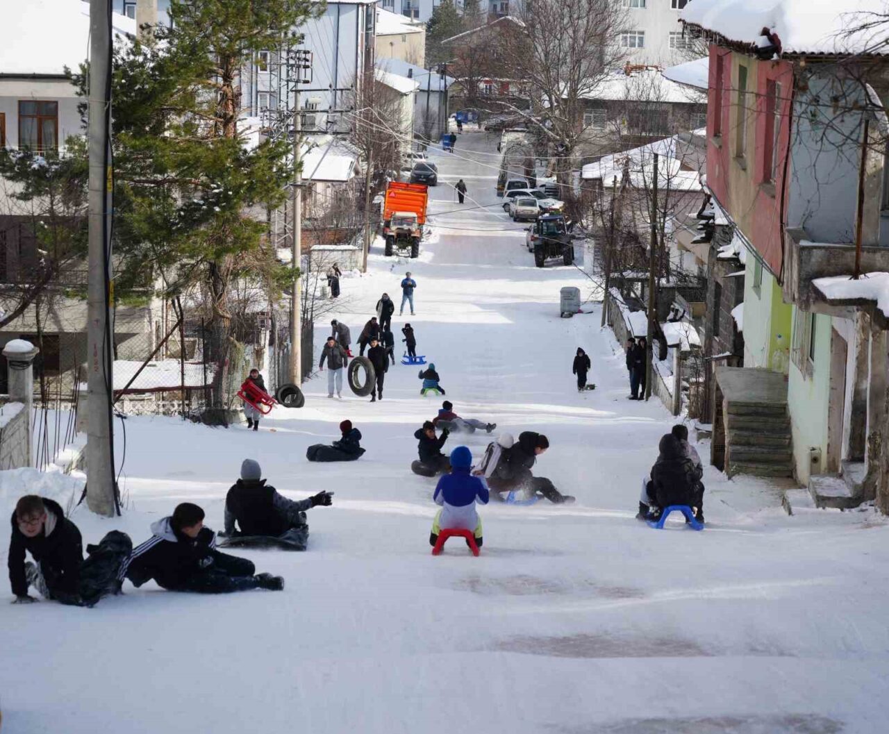 Kızaklarla kayan çocukların eğlenceli anları kameralara yansırken, mahalledeki büyükler de çocukları izleyerek keyifli anlara ortak oldu. Her yıl bu yokuşta kaydıklarını belirten çocuklar, burada çok eğlendiklerini ifade etti.