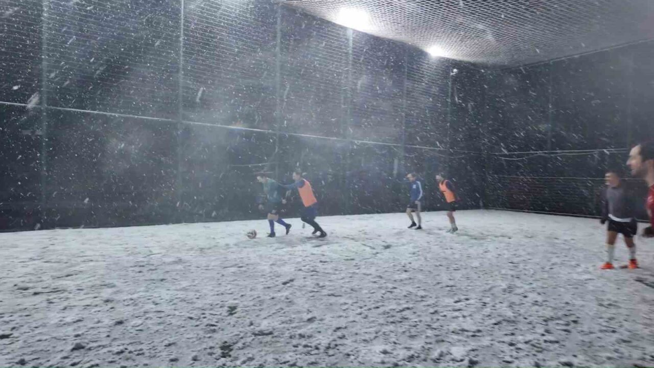 Maltepe’de soğuk hava ve kar yağışına rağmen halı saha maçı yapan bir grup futbolsever, karşılaşmalarını yarıda bırakmadı.