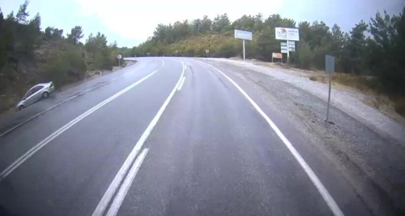 Kaza anı, karşıdan gelen bir otomobilin kamerasında detaylı bir şekilde kaydedildi. Görüntülerde, otomobilin viraja hızlı bir şekilde girdiği, yağmur nedeniyle kayganlaşan yolda kayarak yoldan çıktığı, ardından da yol kenarındaki yağmur suyu tahliye kanalına uçarak takla attığı görüldü.