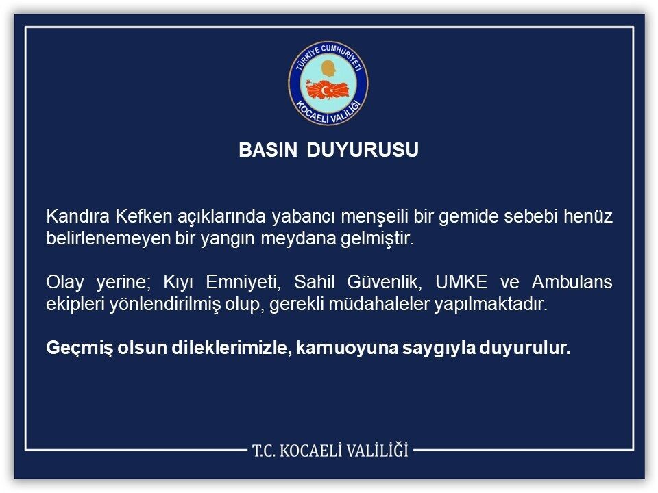 KOCAELİ’NİN KANDIRA İLÇESİ KEFKEN AÇIKLARINDA YABANCI MENŞELİ BİR GEMİDE YANGIN ÇIKTI. HENÜZ NEDENİ BELİRLENEMEYEN YANGIN KISA SÜREDE BÜYÜYÜNCE BÖLGEYE ÇOK SAYIDA EKİP SEVK EDİLDİ.