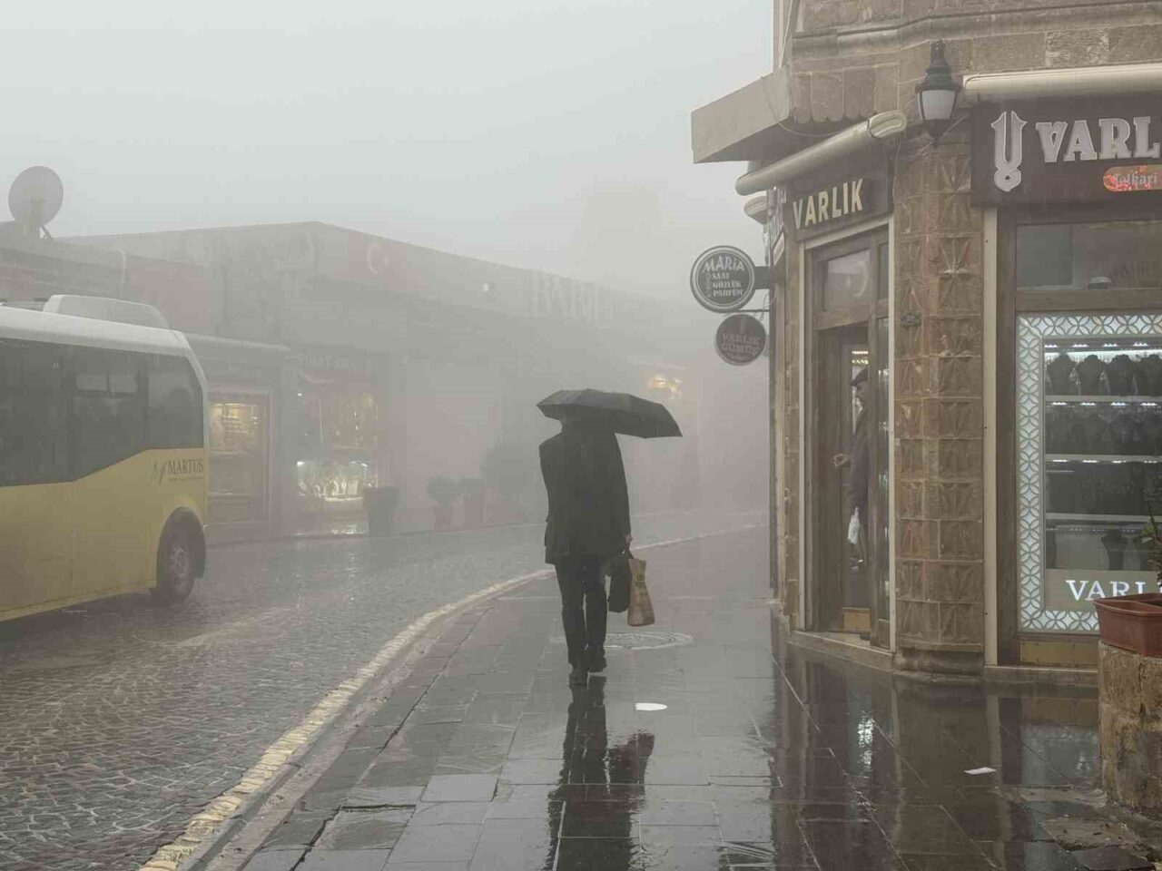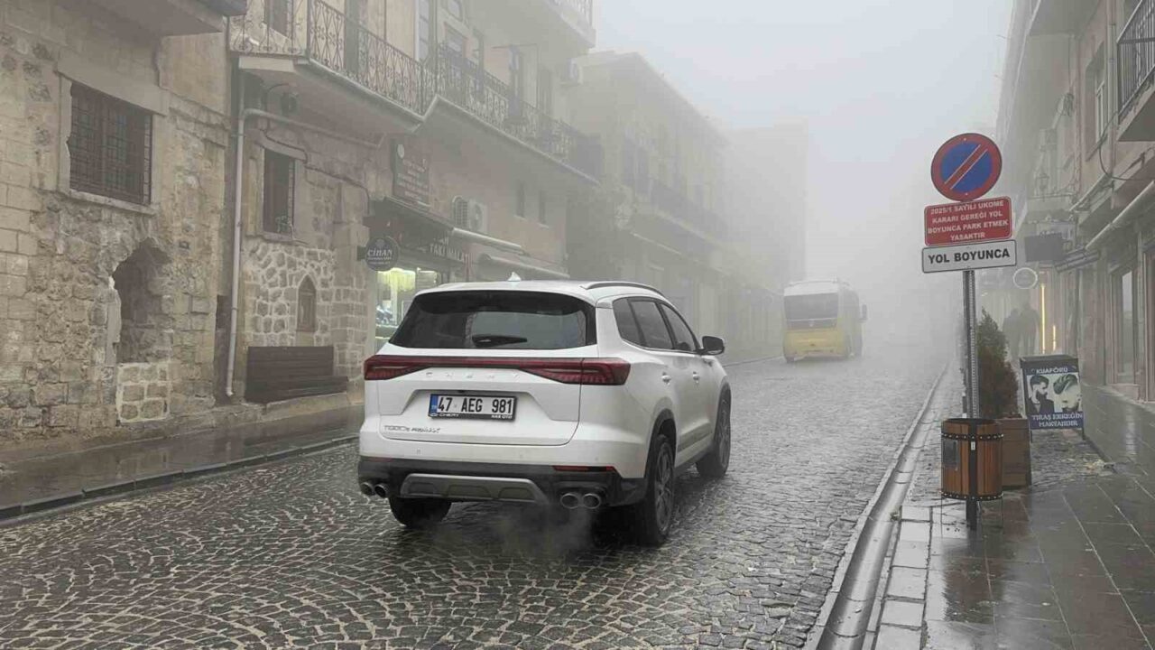 Mardin’de sabah saatlerinden itibaren etkili olan yağmur, yoğun sis ve kuvvetli rüzgar, kentte günlük yaşamı olumsuz etkiledi.