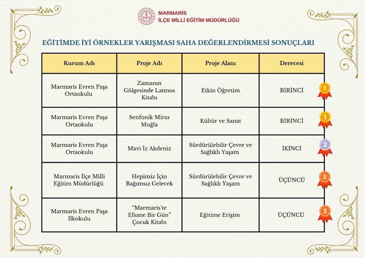 Evren Paşa Ortaokulu da, üç farklı proje ile sırasıyla birincilik ve ikincilik ödülleri aldı. “Zamanın Gölgesinde Latmos Kitabı” adlı proje, Etkin Öğretim alanında birinci, “Senfonik Miras Muğla” Kültür ve Sanat kategorisinde birinci ve “Mavi İz Akdeniz” projesi ise Sürdürülebilir Çevre ve Sağlıklı Yaşam alanında ikincilik ödülünü kazandı.