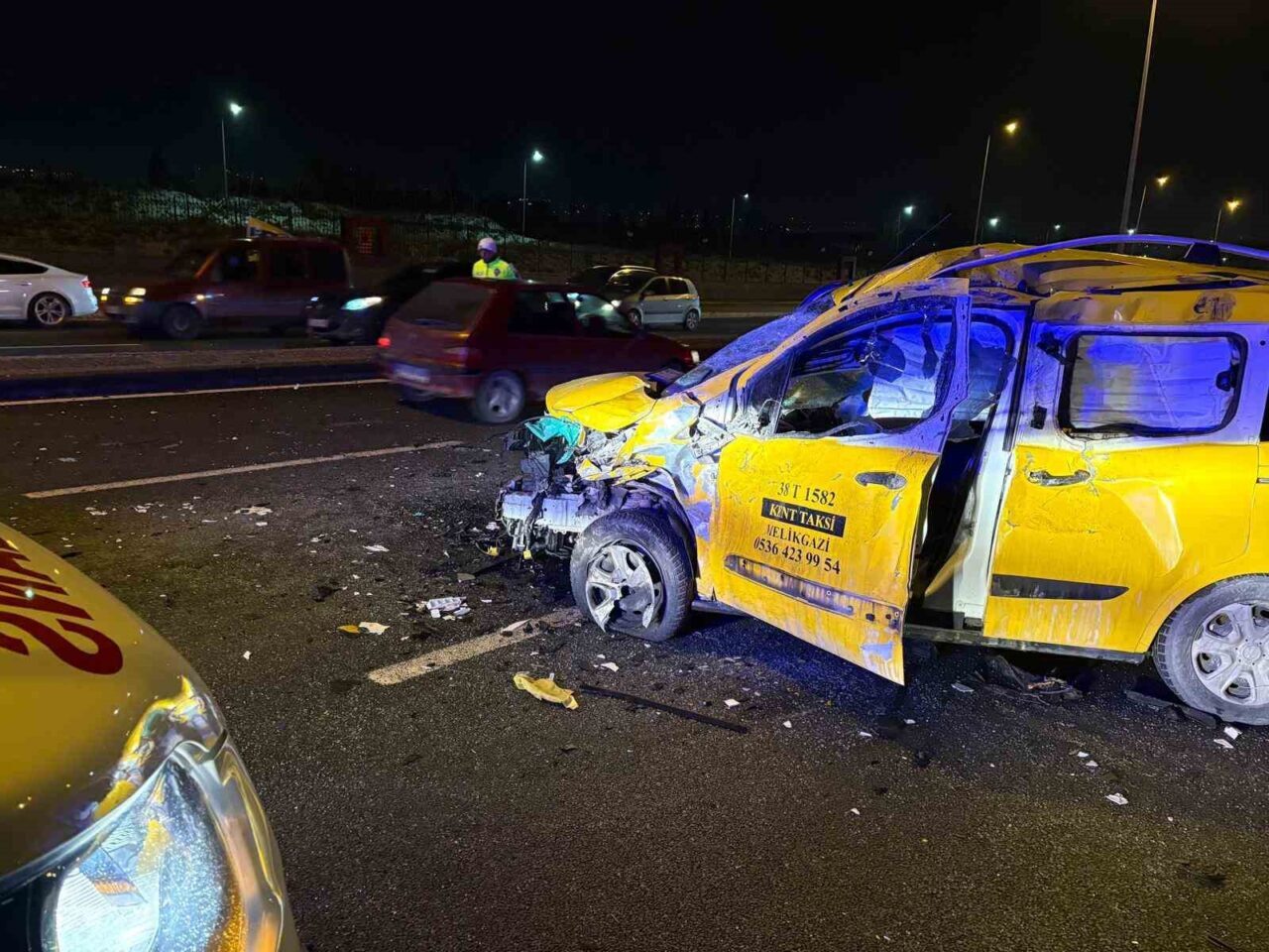 Edinilen bilgiye göre, Köşk Mahallesi Hulusi Akar Bulvarı üzerinde M.O.G. yönetimindeki 38 HS 116 plakalı otomobil, sürücüsünün direksiyon hakimiyetini kaybetmesi sonucu karşı yola geçerek, karşı istikametten gelen N.Y. idaresindeki 38 T 1582 plakalı ticari taksi ile çarpıştı. Çarpışmanın etkisiyle otomobil ve ticari taksi hurdaya dönerken, araçların parçaları da etrafa saçıldı. Kaza sonrası yol kısmi olarak trafiğe kapatılırken, ihbar üzerine bölgeye polis ve sağlık ekipleri sevk edildi. Polis ekipleri yolda güvenlik önlemi alarak, kontrollü şekilde trafiğin akışını sağlarken, sağlık ekipleri de kazada ağır yaralanan M.O.G. ve N.Y. ile ticari takside bulunan 1 yolcuyu olay yerindeki ilk müdahalenin ardından ambulansla hastaneye kaldırdı. Ekiplerin çalışmalarının ardından araçlar çekiciyle yoldan kaldırıldı.