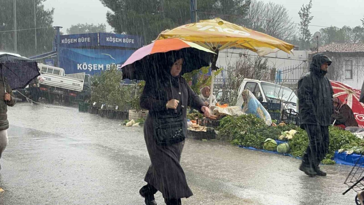 Muğla’nın Menteşe ilçesinde sabah saatlerinden itibaren etkili olan şiddetli sağanak yağış ve fırtına, Perşembe Pazarı’nda vatandaş ve esnafa zor anlar yaşatıyor.
