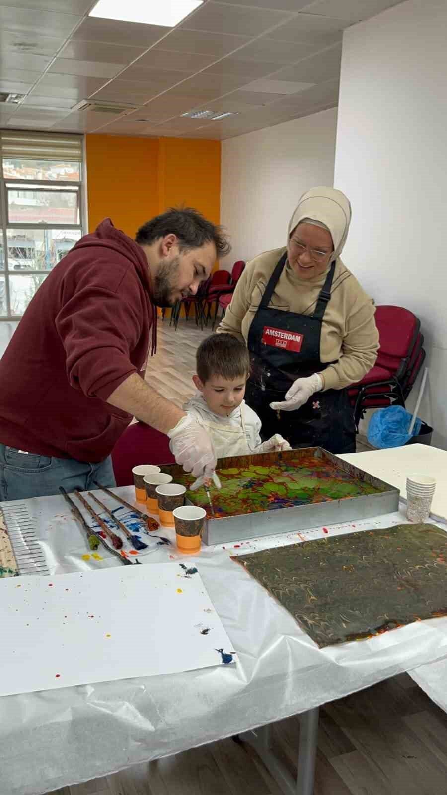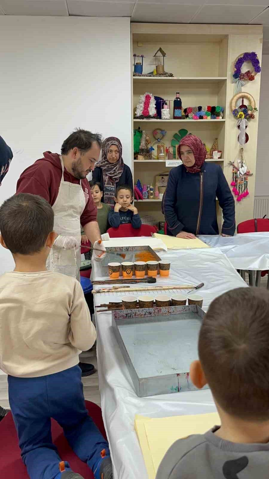 Menteşe’de “Okullar Merkezimizde” programı çerçevesinde düzenlenen etkinlikte, aileler ve çocuklar geleneksel Türk sanatlarından ebru sanatıyla buluşma fırsatı buldu.