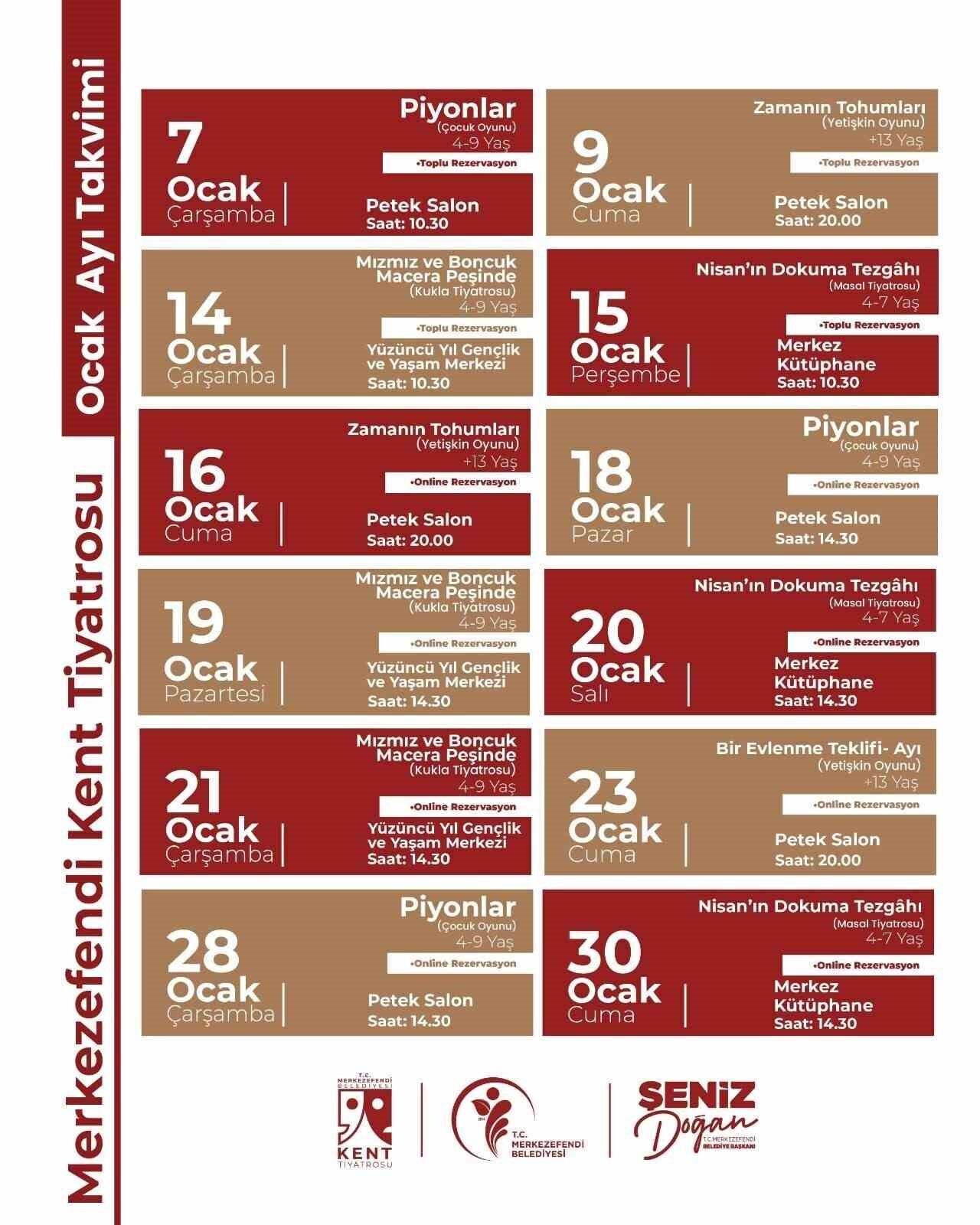 Merkezefendi Kent Tiyatrosu’nun Ocak ayındaki oyun takvimi ise şu şekilde belirlendi: Tiyatro ekibi, ‘Zamanın Tohumları’ oyununu 9 Ocak Cuma günü saat 20.00’de Merkezefendi Kültür Merkezi’nde, ‘Mızmız ve Boncuk Macera Peşinde’ oyununu 14 Ocak Çarşamba günü saat 10.30’da Yüzüncü Yıl Gençlik Merkezi’nde, ‘Nisan’ın Dokuma Tezgâhı’ oyununu 15 Ocak Perşembe günü saat 10.30’da Merkez Kütüphane’de, ‘Zamanın Tohumları’ oyununu 16 Ocak Cuma günü saat 20.00’de Merkezefendi Kültür Merkezi’nde, ‘Piyonlar’ oyununu 18 Ocak Pazar günü saat 14.30’da Merkezefendi Kültür Merkezi’nde, ‘Mızmız ve Boncuk Macera Peşinde’ oyununu 19 Ocak Pazartesi günü saat 14.30’da Yüzüncü Yıl Gençlik Merkezi’nde, ‘Nisan’ın Dokuma Tezgâhı’ oyununu 20 Ocak Salı günü saat 14.30’da Merkez Kütüphane’de, ‘Mızmız ve Boncuk Macera Peşinde’ oyununu 21 Ocak Çarşamba günü saat 14.30’da Yüzüncü Yıl Gençlik Merkezi’nde, ‘Bir Evlenme Teklifi – Ayı’ oyununu 23 Ocak Cuma günü saat 20.00’de Merkezefendi Kültür Merkezi’nde, ‘Piyonlar’ oyununu 28 Ocak Çarşamba günü 14.30’da Merkezefendi Kültür Merkezi’nde ve ‘Nisan’ın Dokuma Tezgâhı’ oyununu 30 Ocak Cuma günü saat 14.30’da Merkez Kütüphane’de sergileyecek.