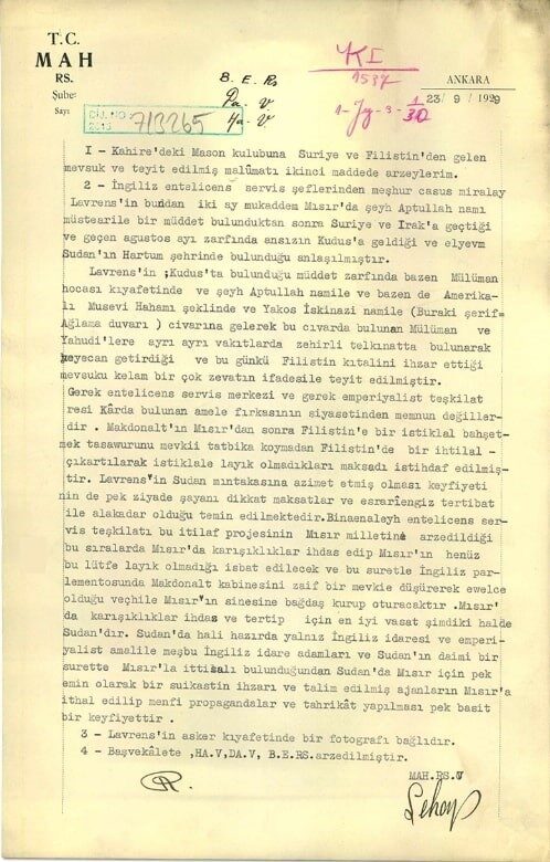 Aynı zamanda belgede, Arabistanlı Lawrence’ın asker kıyafeti ile çekilmiş bir fotoğrafının da bulunduğu raporda şu ifadelere yer verilmektedir: “Kahire’deki Mason kulübüne Suriye ve Filistin’den gelen mevsuk ve teyit edilmiş malumatı ikinci maddede arz eylerim. İngiliz entelicens servis şeflerinden meşhur casus Miralay Lavrens’in bundan iki ay önce Mısır’da şeyh Aptullah adıyla bir süre bulunduktan sonra Suriye ve Irak’a geçiş yaptığı ve geçen ağustos ayında ansızın Kudüs’e geldiği ve elyevm Sudan’ın Hartum şehrinde bulunduğu anlaşılmıştır. Lavrens’in, Kudüs’te bulunduğu müddet zarfında bazen Müslüman hocası kıyafetiyle ve şeyh Aptullah adıyla, bazen de Amerikalı Musevi hahamı şeklinde ve Yakos İskinazi adıyla (buraki şerif-ağlama duvarı) çevresine gelerek Müslüman ve Yahudilere ayrı ayrı vakıtlarda zehirli telkinalarda bulunduğu ve heyecan yarattığı ve bugünkü Filistin kıtalini ihzar ettiği mevsuku kelam birçok zevatın ifadesiyle teyit edilmiştir.