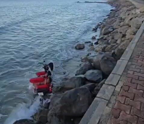 Seyir halindeki üç tekerlekli elektrikli motosiklet, kontrolden çıkarak denize düştü.