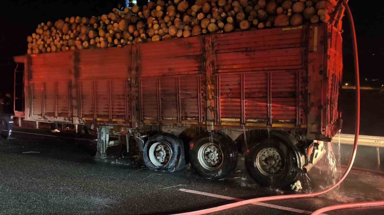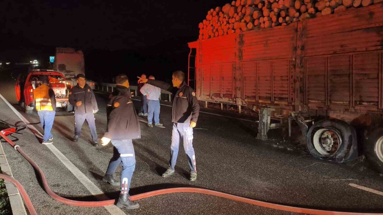 Muğla çevre yolunda seyir halindeki bir tomruk yüklü TIR’da, aniden başlayan lastik yangını itfaiye ekiplerinin hızlı müdahalesi ile kontrol altına alındı.