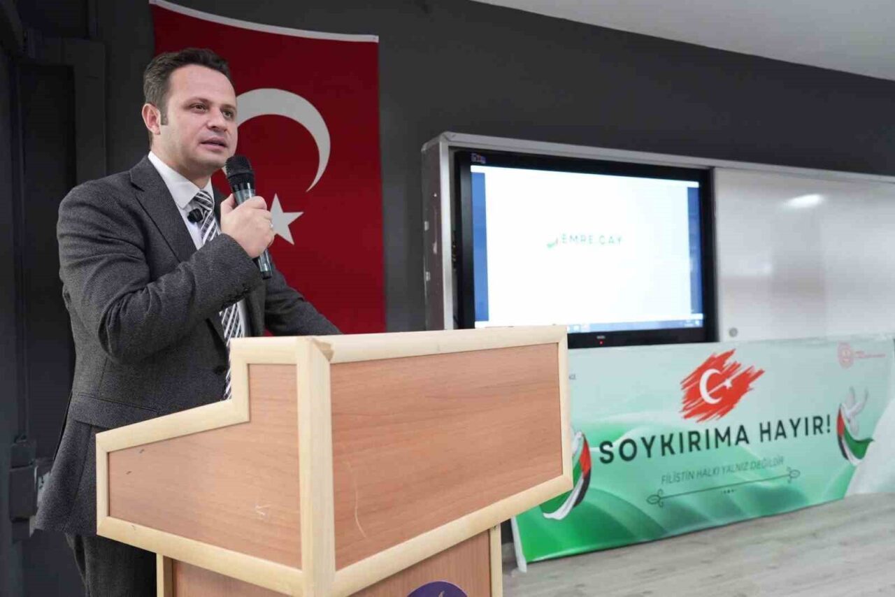 Etkinlikte söz alan Millî Eğitim Müdürü Emre Çay, Filistin’deki yaşanan dram karşısında duyarlılığın önemine dikkat çekti. Çay, “Filistin’de yaşanan insanlık dramı karşısında sessiz kalmamak, vicdanı diri tutmak hepimizin ortak sorumluluğudur. Bugün burada, öğrencilerimizin kalplerinde insanlık onurunu, adalet duygusunu ve merhameti yaşatmak için bir aradayız” şeklinde konuştu.