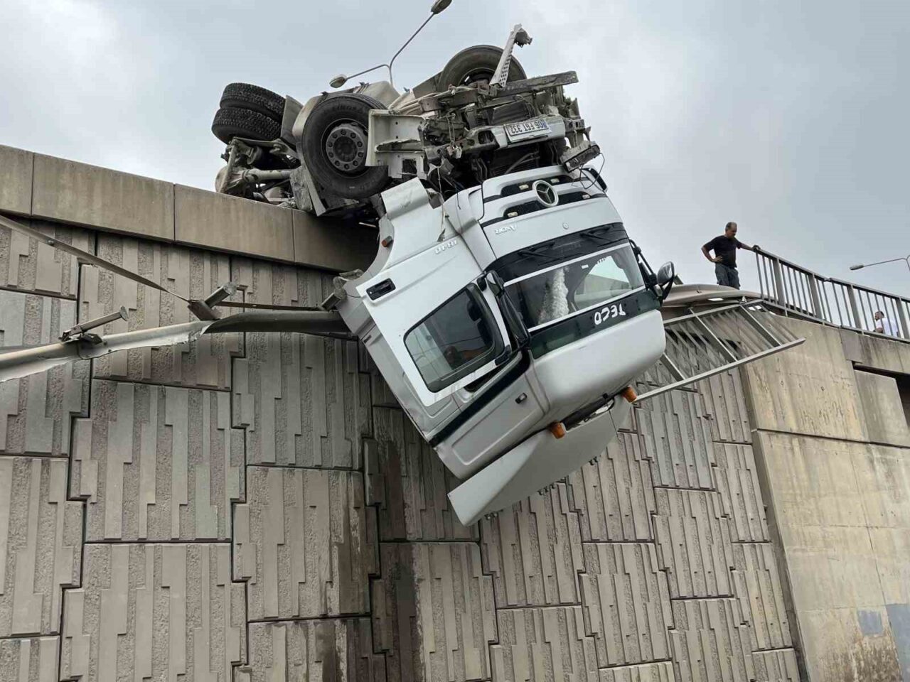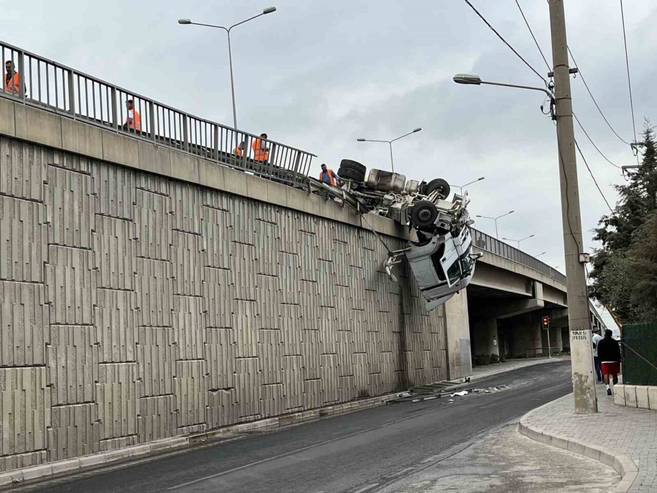 İZMİR’İN BORNOVA İLÇESİNDE YAĞMUR NEDENİYLE KAYGANLAŞAN ZEMİNDE KONTROLDEN ÇIKIP DEVRİLEREK VİYADÜKTE ASKIDA KALAN TIRIN KAZA ANI ORTAYA ÇIKTI.