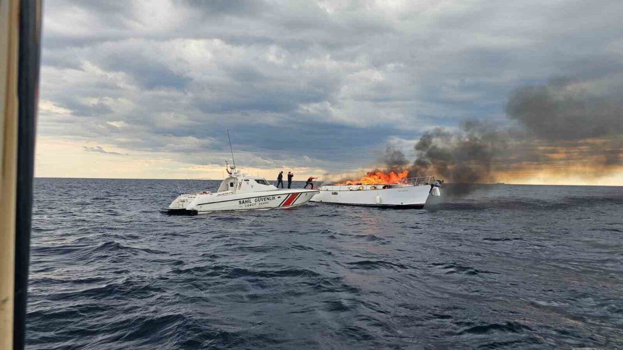 ANTALYA’NIN KAŞ İLÇESİ KALKAN AÇIKLARINDA SEYİR HÂLİNDEYKEN YANMAYA BAŞLAYAN VE SAHİL GÜVENLİK EKİPLERİNİN HIZLI MÜDAHALESİYLE KAPTANININ KURTARILDIĞI TEKNENİN YANMA ANLARI DRONLA GÖRÜNTÜLENDİ.
