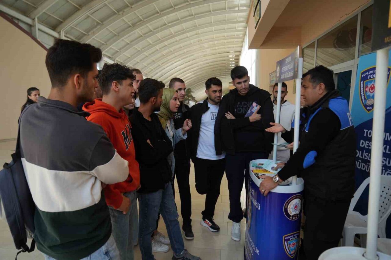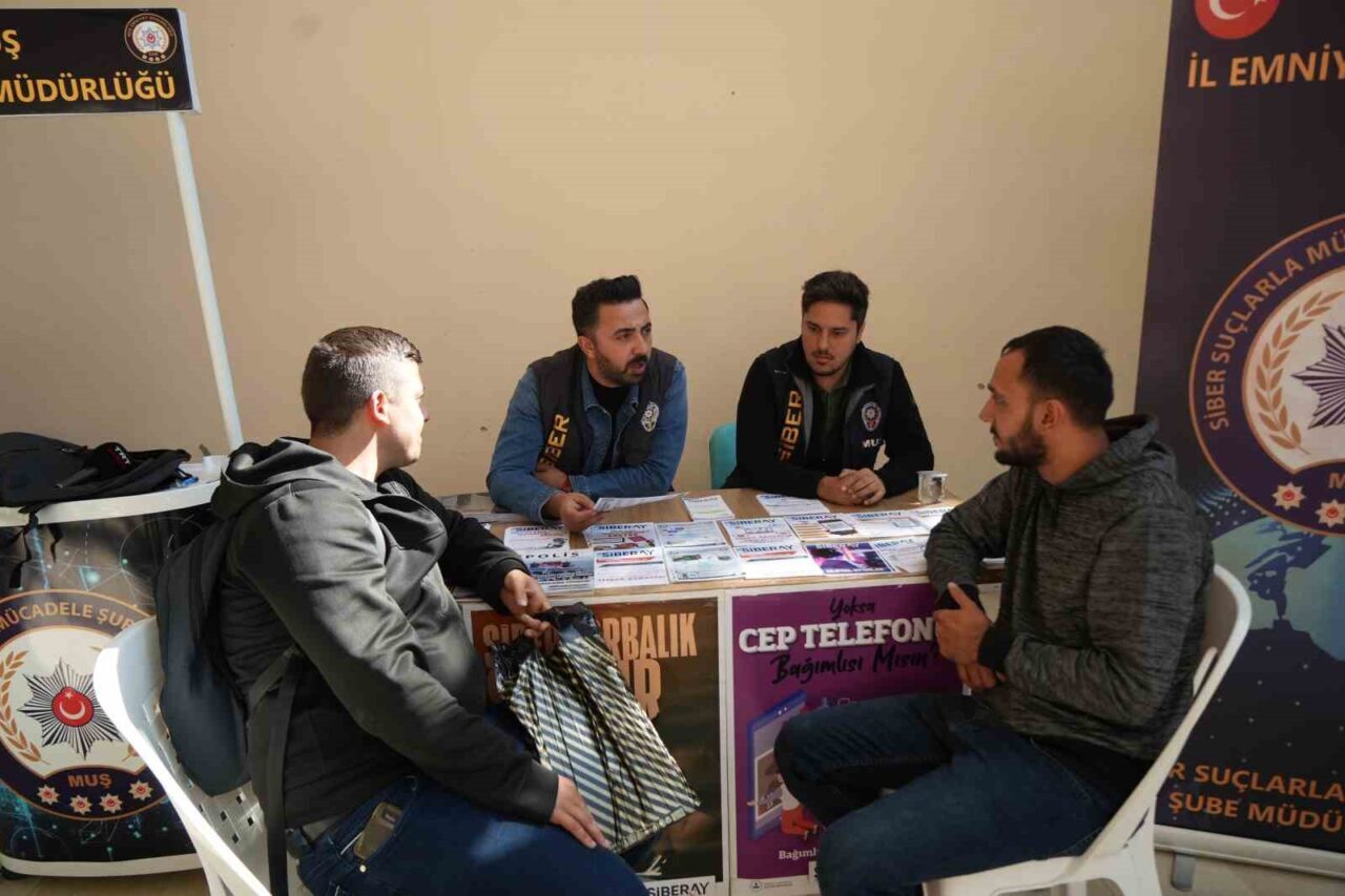 Muş İl Emniyet Müdürlüğü’ne ait Terörle Mücadele, Güvenlik, Siber Suçlarla Mücadele, Narkotik ve Toplum Destekli Polislik Şube Müdürlükleri, üniversite kampüsünde stand kurarak öğrencilere eğitim verdi. Söz konusu “El Ele Güvenli Geleceğe Projesi” çerçevesinde gerçekleştirilen etkinlikte, terör örgütlerinin insanları nasıl hedef haline getirdiği, yasal olmayan gruplara katılmamanın önemi, sosyal medya kullanımıyla ilgili dikkat edilmesi gerekenler, suç örgütlerinin propagandasına karşı bilinçli olmanın gerekliliği ve uyuşturucu kullanımının birey ve topluma olan zararları hakkında bilgiler sunuldu.