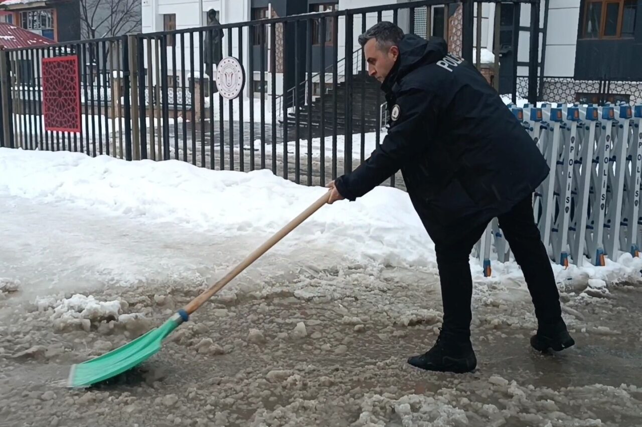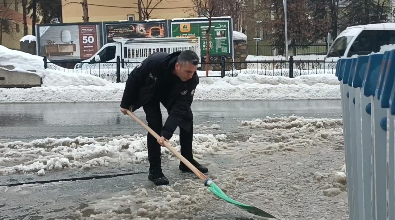 Kentte etkili olan yoğun kar yağışının ardından eriyen kar suları cadde ve kaldırımları adeta göle çevirdi. Vatandaşların su birikintisi nedeniyle ilerleyemediğini gören bir polis, çevreden temin ettiği kürekle rögar yönüne doğru suyu akıtmaya başladı. Kısa sürede gerçekleştirilen müdahale sayesinde kaldırım ve yol üzerindeki su seviyesi düşerken, vatandaşlar güvenli şekilde geçiş yapabildi. Polis memurunun bu duyarlı davranışı, çevrede bulunan vatandaşların da takdirini topladı.