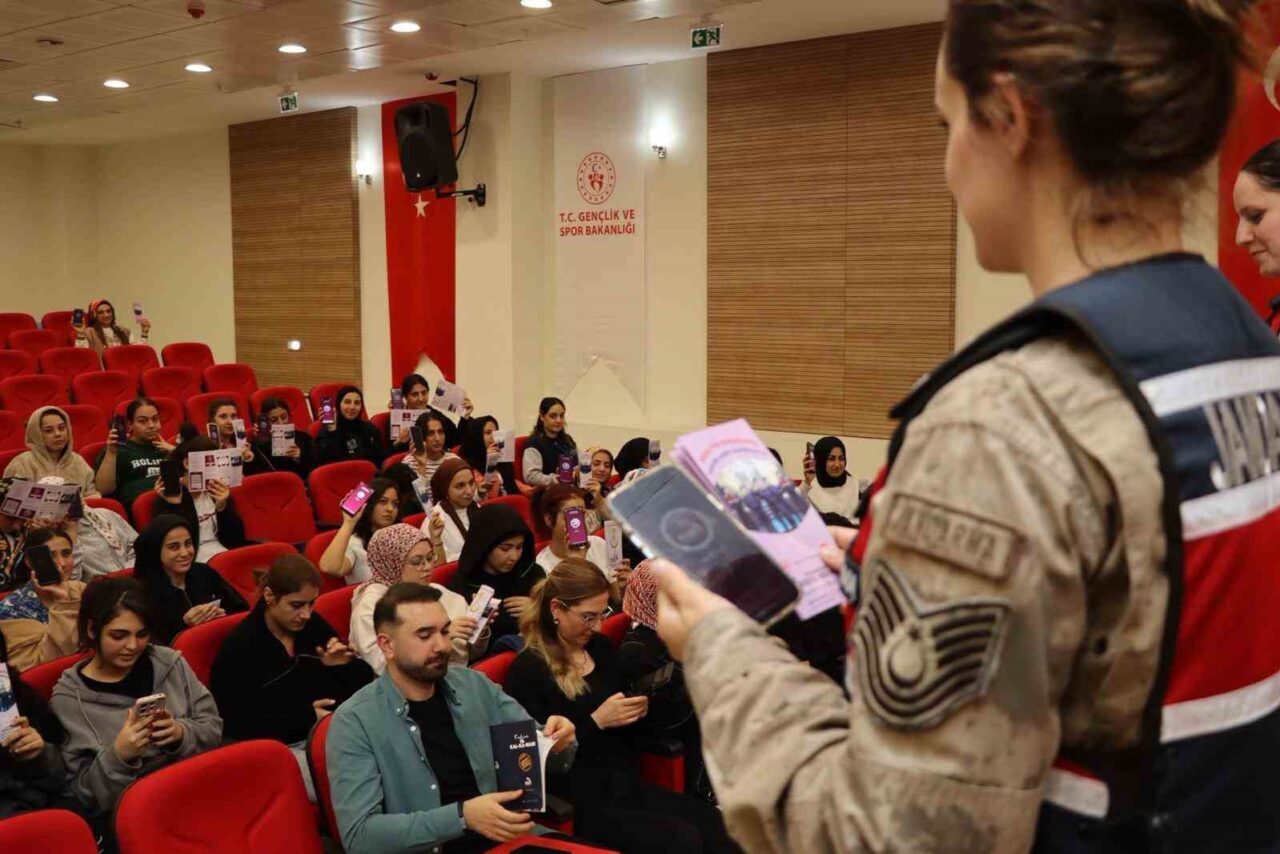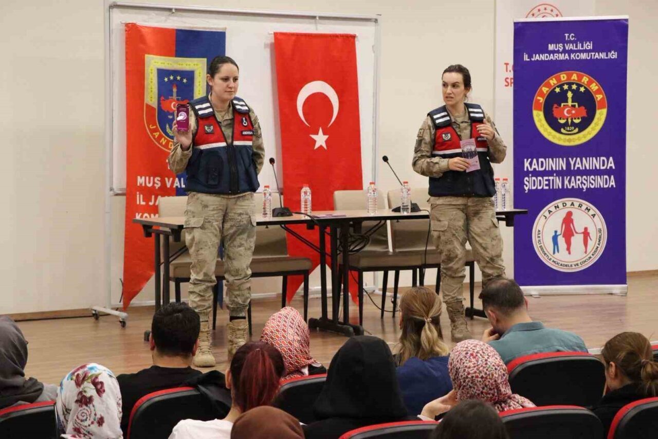 Muş’ta görev yapan jandarma ekipleri, Sultan Alparslan Kız Öğrenci Yurdu’nda kalan 160 üniversite öğrencisine kadına yönelik şiddetle mücadele amaçlı olarak KADES uygulamasıyla ilgili önemli bilgiler verdi.