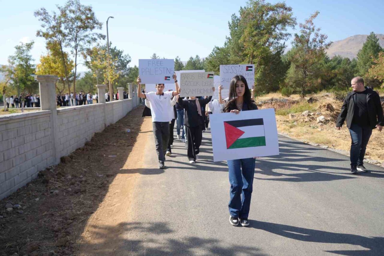 Muş’taki Erentürk Öz Şeker Anadolu Lisesi’nde öğrenim gören öğrenciler, İsrail’in Gazze’ye düzenlediği saldırılara karşı duyarlılık oluşturmak amacıyla Filistin’e destek yürüyüşü gerçekleştirdi.