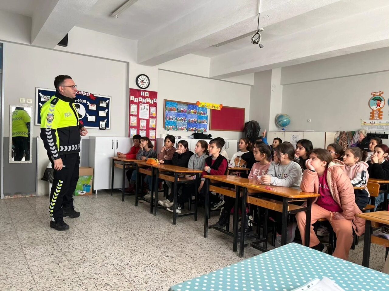 Nazilli’de Güvenli Trafik Eğitimi Projesi kapsamında Aydoğdu Adnan Menderes İlkokulu öğrencilerine, İlçe Emniyet Müdürlüğü ekipleri tarafından trafik kuralları ve yaya güvenliği konularında eğitim verildi.