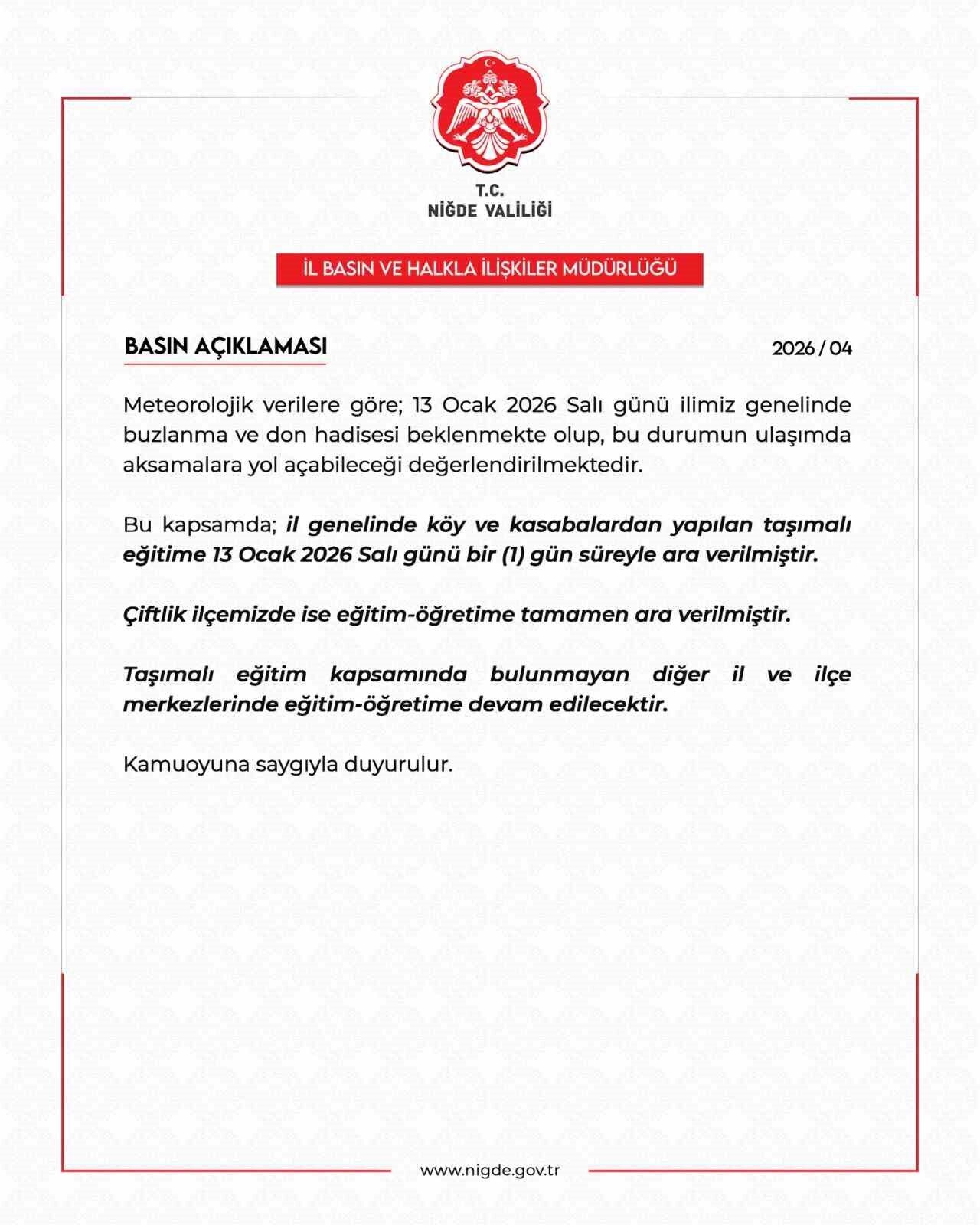 Yapılan basın açıklamasında, 13 Ocak 2026 Salı günü Niğde genelinde buzlanma ve don olayının etkili olmasının beklendiği, bu durumun özellikle ulaşımda aksamalara yol açabileceği bildirildi. Öğrencilerin güvenliğini sağlamak amacıyla il genelinde köy ve kasabalardan yapılan taşımalı eğitime bir gün süreyle ara verildiği belirtildi.