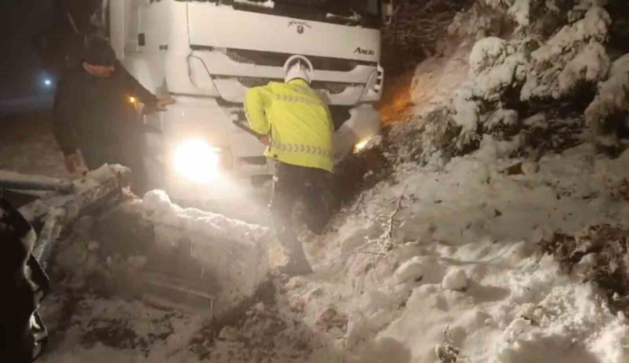 Tokat-Niksar D850 karayolu Musapınarı mevkiinde gerçekleşen makaslama sonucu yol trafiğe kapandı. İhbarın ardından, Erbaa Bölge Trafik İstasyon Amirliğine bağlı ekipler, olay yerine kısa sürede sevk edildi. Yoğun kar yağışı ve buzlanmanın etkili olduğu bölgede yapılan çalışmalar zaman zaman zorlukla yürütüldü. Polis ekipleri, Karayolları ekipleri ve çevredeki vatandaşların desteğiyle küreklerle kürüme çalışması yaparak yolu açmak için yoğun çaba sarf etti. Yaklaşık 1 saat süren çalışmaların ardından makaslayan tır bulunduğu yerden kurtarıldı. Yolun yeniden trafiğe açılmasıyla birlikte bölgede ulaşım normale dönerken, ekipler sürücülere dikkatli olmaları ve zincirsiz yola çıkmamaları uyarısında bulundu.