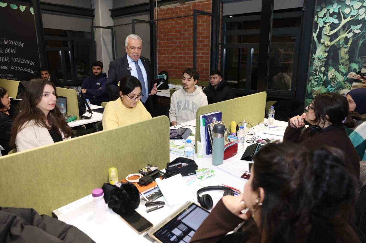 Nilüfer Belediye Başkanı Şadi Özdemir, sınav dönemlerinde 24 saat hizmet veren Koza Kütüphane’de finallere hazırlanan üniversite öğrencileriyle bir araya geldi.