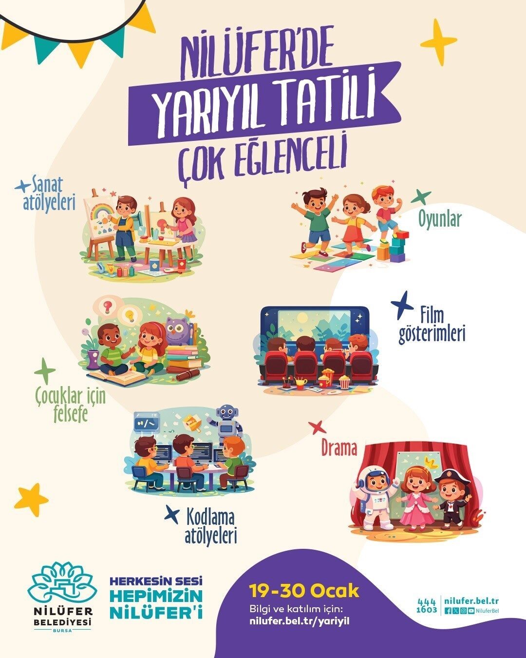 Nilüfer Belediyesi, yarıyıl tatiline girecek çocuklar için 2 hafta süresince dolu dolu bir etkinlik programı hazırladı. Nilüferli çocuklar tatil boyunca hem öğrenip hem de eğlenceli vakit geçirecek. 19-30 Ocak tarihleri arasında gerçekleştirilecek sanat atölyeleri, oyunlar ve film gösterimleri gibi farklı etkinliklerle çocuklar birçok alanda kendilerini geliştirme fırsatı bulacak.