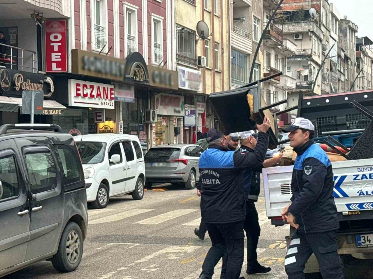 Ordu Zabıta Müdürlüğü ekipleri, Zübeyde Hanım Caddesi’ndeki kaldırımları işgal eden malzemeleri topladı.