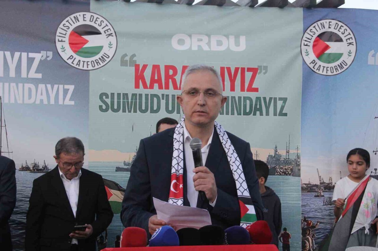 Etkinlikte ilk olarak Kur’an-ı Kerim okunmasıyla başlayan programda konuşan Filistin Destek Platformu Ordu İl Başkanı Olgun Küçük, Gazze’de yaşanan insani durumu sadece yerel bir acı değil, tüm dünya için bir ahlaki kriz olarak değerlendirdi. Küçük, “Sumud Filosu’nun yiğit bireyleri, umudu yeşerten ve dayanışmayı artıran herkesin bir gün başkalarının umudu olabileceğini hatırlatıyor. Bu yolculuk yalnızca deniz yolculuğu değil, aynı zamanda insanlığın vicdanını yeniden uyandırmak için atılan bir adımdır. Bizler de bu çağrıya kulak verip zulmün karanlığını aydınlatacak bir kıvılcıma dönüşebiliriz” şeklinde konuştu.