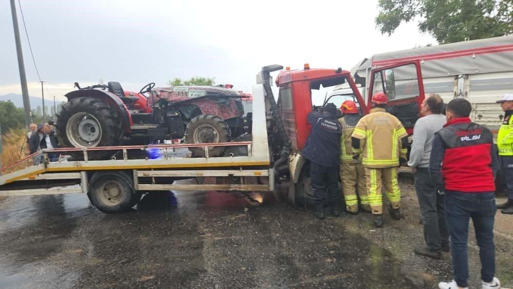 Kazanın saat 17.00 sıralarında meydana geldiği belirtildi. Edinilen bilgilere göre, Ertuğrul Çakır (60) yönetimindeki 16 F 8512 plakalı traktör yüklü çekici, Orhangazi’den İznik yönüne seyir halindeyken Gölyaka mahallesi girişindeki virajda karşıdan gelen Reis Ülgen (40) yönetimindeki 35 BPN 769 plakalı kamyonetle kafa kafaya çarpıştı.