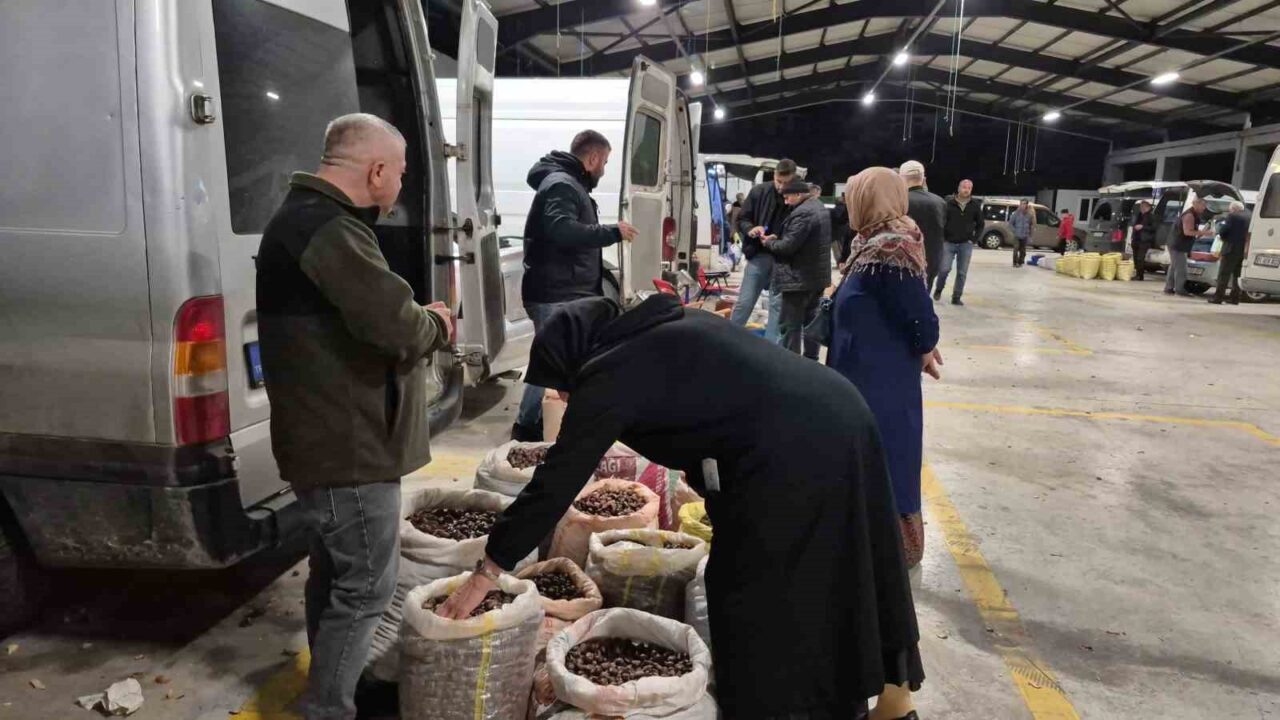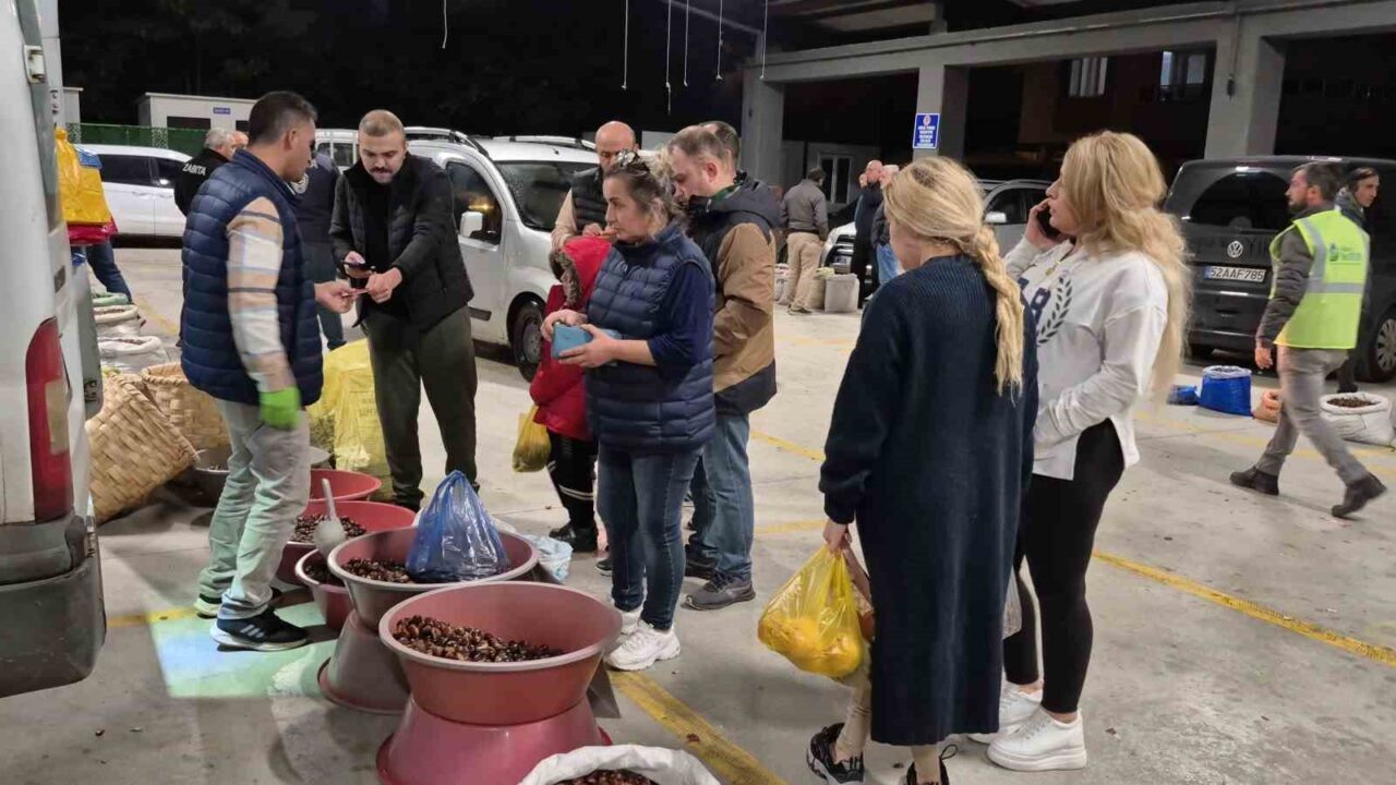 TADI VE AROMASIYLA ÜNLÜ DÜZCE KUZU KESTANESİ PAZARDA ALICILARI İLE BULUŞURKEN ALMAK İSTEYEN ALICILAR, SIKI PAZARLIKLARA GİRİYOR. DÜZCE’Yİ ETKİSİ ALTINA ALAN YAĞMURA RAĞMEN KUZU KESTANE MERAKLILARI KESTANE PAZARINI DOLDURDU. AKŞAM SAATLERİNDE KESTANE PAZARINI ZİYARET EDEN BELEDİYE BAŞKANI ÖZLÜ’DE SIKI PAZARLIKTA ARACILIK YAPTI