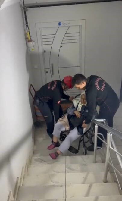Olay, Rahime Hatun Mahallesi 9053 Sokak’ta meydana geldi. Tekerlekli sandalyede bulunan Canset Gözükara, dışarı çıktığı esnada yaşanan elektrik kesintisi nedeniyle asansörün devre dışı kalması sonucu binasına geri dönemedi. Durumun bildirilmesi üzerine 112 Acil Çağrı Merkezi aracılığıyla Osmaniye Belediyesi İtfaiye Müdürlüğü ekiplerinden yardım talep edildi. İhbar üzerine adrese sevk edilen itfaiye ekipleri, yaşlı kadını iki personel eşliğinde merdivenlerden taşıyarak ikinci kattaki dairesine güvenli bir şekilde ulaştırdı. Bu sırada bir kadın komşunun el feneriyle ekiplere yardımcı olduğu görüldü.