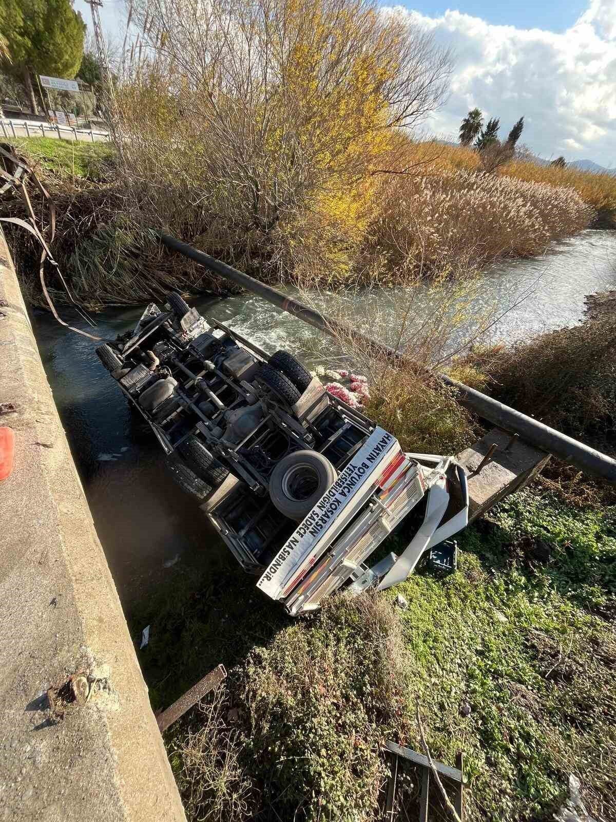 Osmaniye’de kontrolden çıkan turp yüklü kamyon, köprü korkuluklarını kırarak dereye devrildi. Kazada kamyon şoförü yaralandı.
