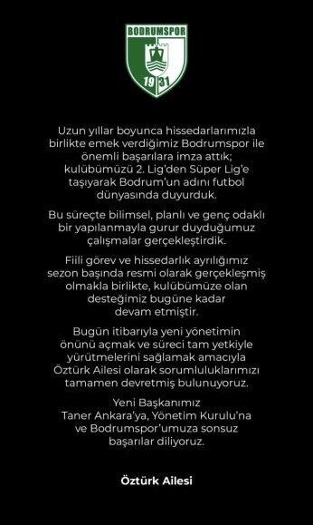 Bodrum Futbol Kulübü’nün yöneticilerinden Öztürk Ailesi, kulüpteki sorumluluklarını devrettiklerini açıkladı.