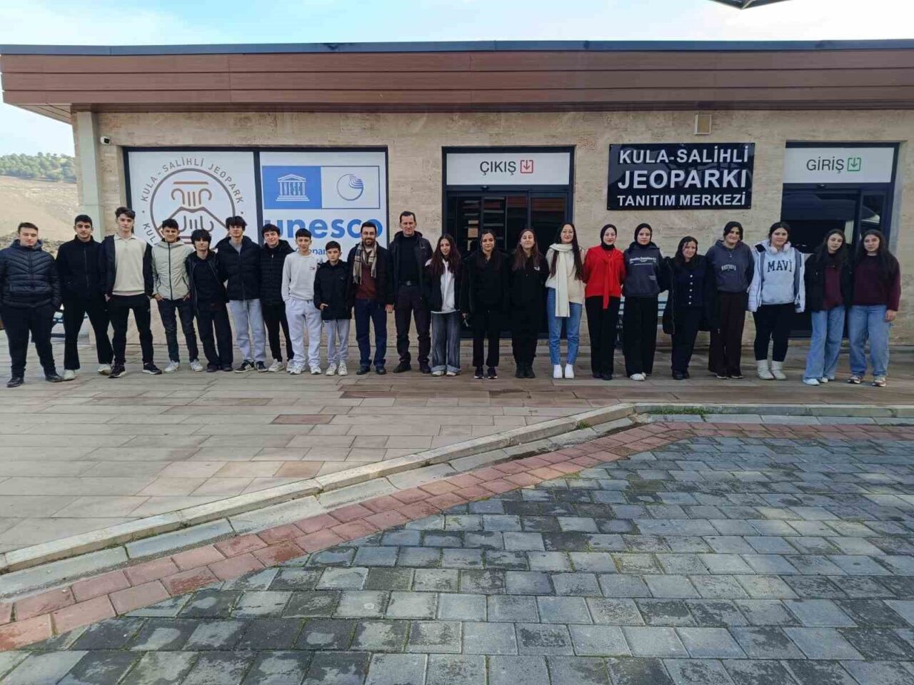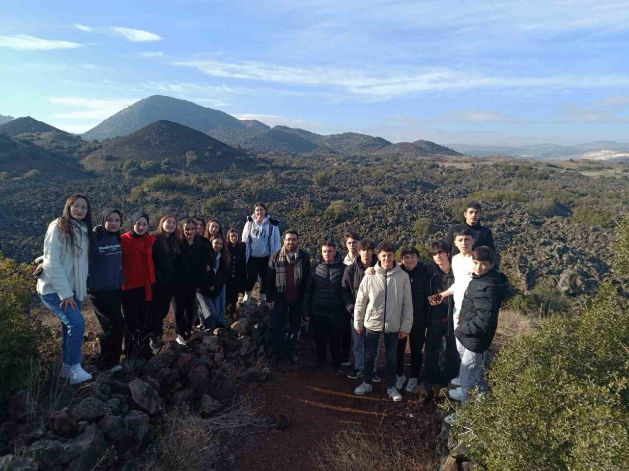 Güne Kula Volkanik Sahası’nda başlayan 20 kişilik öğrenci grubu, Coğrafya Öğretmeni Rıdvan Koca rehberliğinde UNESCO tescilli Kula-Salihli Jeoparkı’nı inceledi. Türkiye’nin en genç volkanik bölgesinde lav tüplerinden cüruf konilerine kadar tüm oluşumları yerinde gören gençler, coğrafya dersini “yanık ülke” olarak bilinen sahada yaşayarak öğrendi.