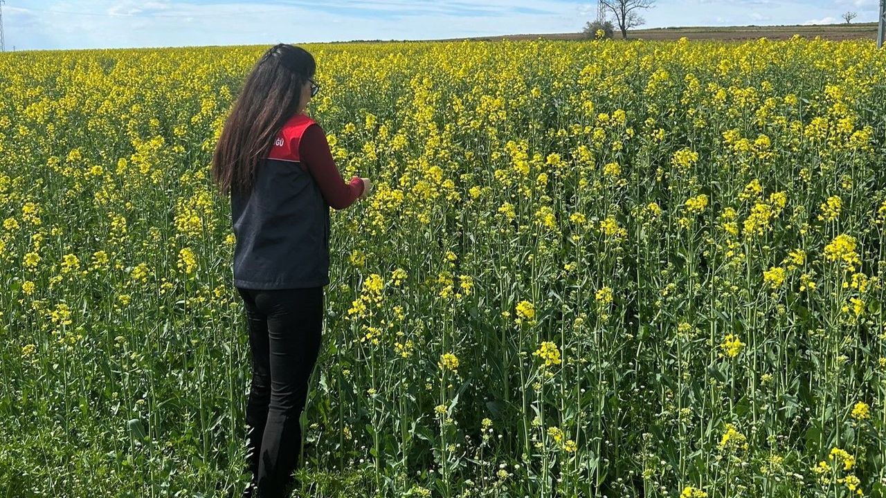 Kırklareli'nin Pehlivanköy ilçesinde çiçek açan kanola bitkisinin fizyolojik gelişimi ve toprak nem durumu yerinde incelendi.