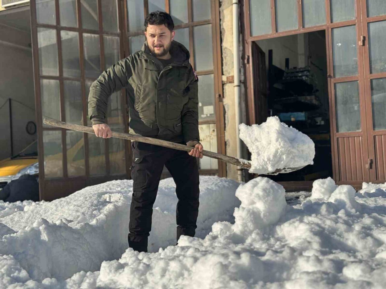Diğer yandan bir esnaf, kar altında kalan ve buz tutan aracının kapısını pürmüz yardımıyla açarken, karla kaplı çatısının çökmemesi için forkliftle destek sağladı.