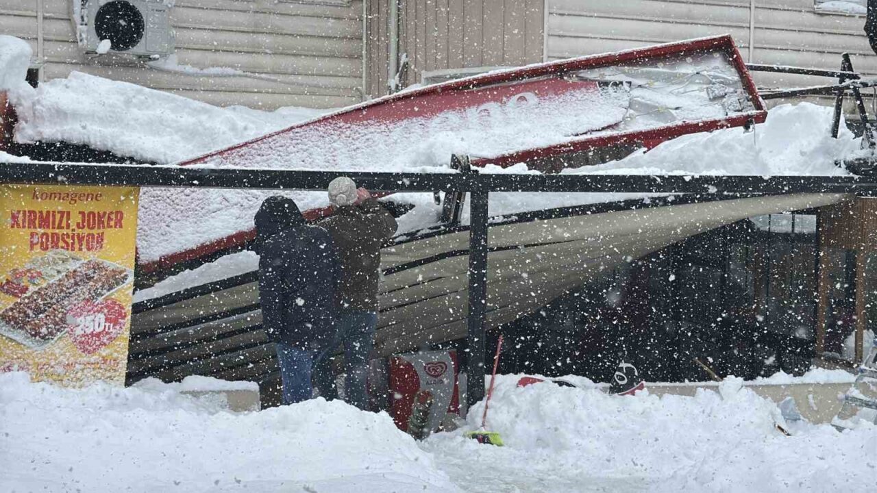 Olay, Sadri Artunç Caddesi’nde gerçekleşti. Yoğun kar yağışının ardından biriken karın ağırlığına dayanamayan iş yerlerine ait çatı ve tenteler çöktü.
