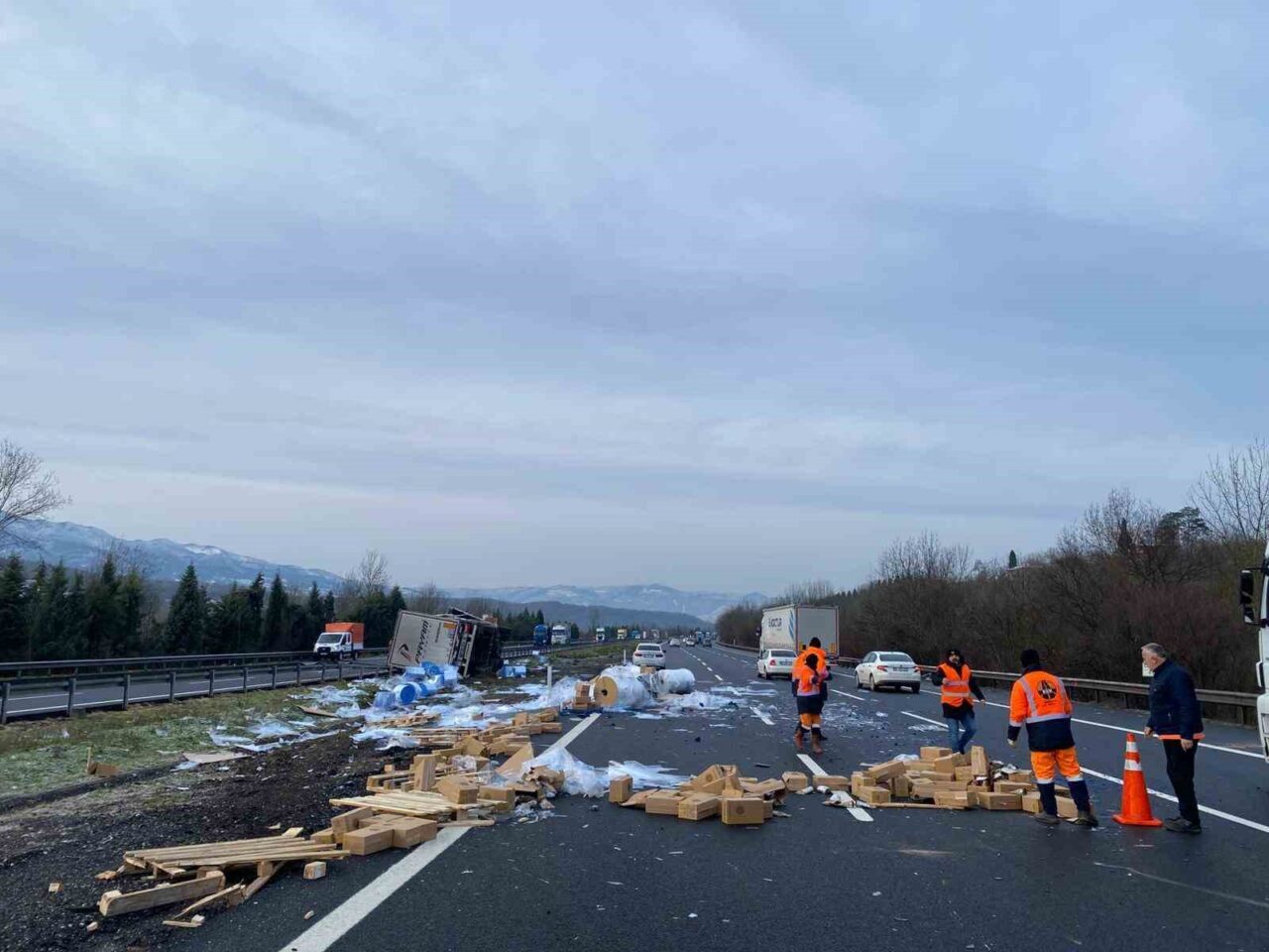 Anadolu Otoyolu Sakarya geçişinde kontrolden çıkarak refüje çarpıp yan yatan tırın sürücüsü yaralandı. Dorsedeki malzemeler otoyola saçıldı.