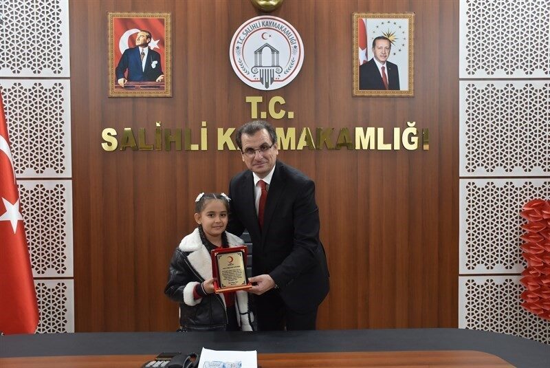 Manisa’nın Salihli ilçesinde 29 Ekim-4 Kasım Kızılay Haftası etkinlikleri kapsamında düzenlenen “Salihli Sana Kanım Feda” kan bağışı kampanyasında dereceye giren öğrenciler, Salihli Kaymakamı Ali Güldoğan’ı makamında ziyaret etti.