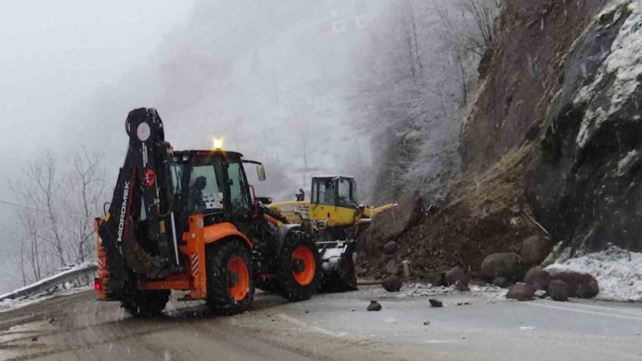 Trabzon’un Şalpazarı-Beşikdüzü karayolunda dün akşam saatlerinde başlayan şiddetli yağmurun ardından etkili olan kar yağışı nedeniyle heyelan meydana geldi.